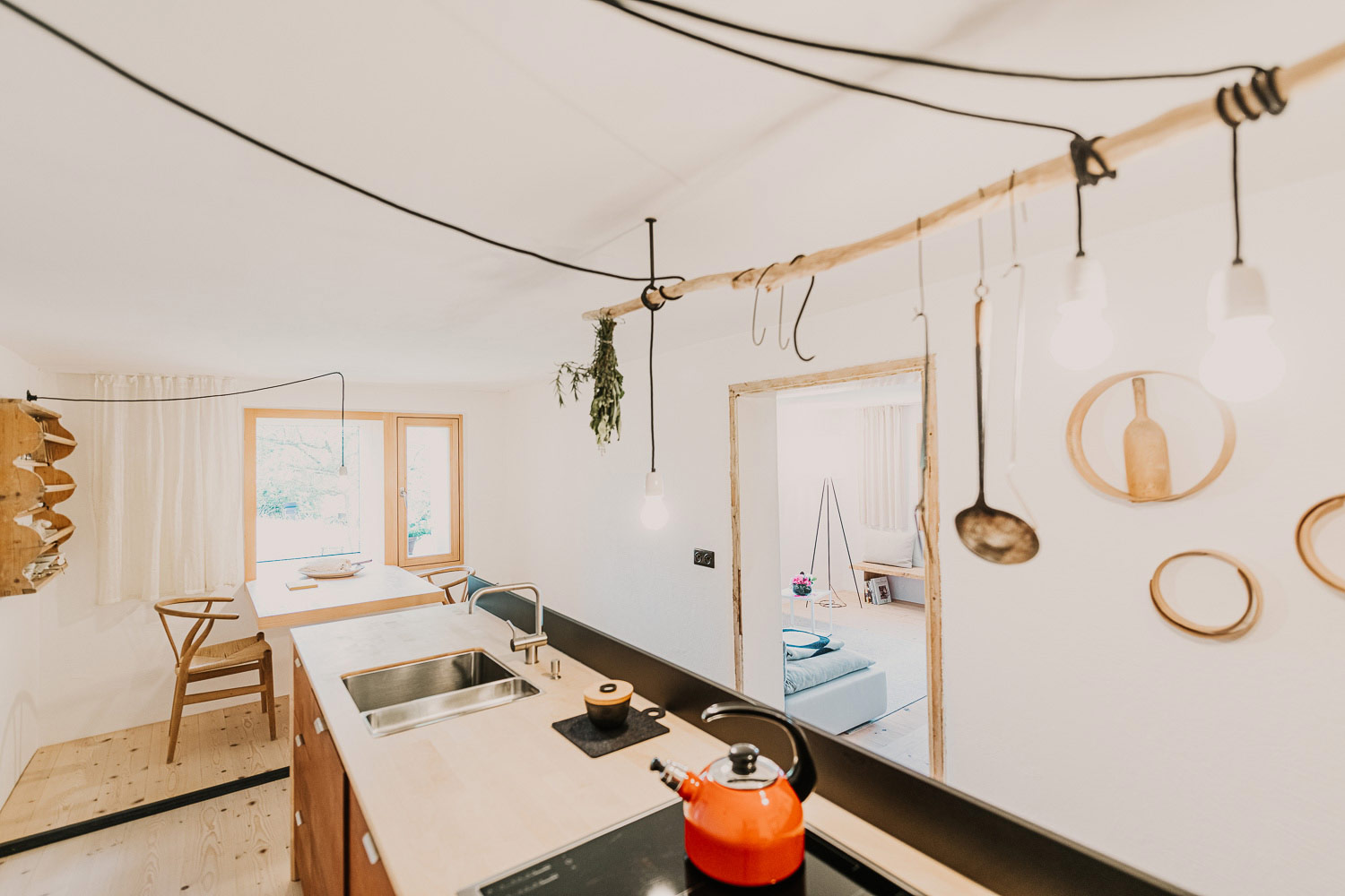 Es duftet nach Holz. Das Gefühl, angekommen zu sein. Die Ferienwohnung "Das Nest" ist 34 Quadratmeter Geborgenheit auf zwei Ebenen. Das ökologische Schlafzimmer wurde rundum mit unbehandeltem Fichtenholz ausgekleidet und besitzt ein Bett, das kein Metall kennt. Im Wohnzimmer setzt das E15 Sofa vom Designer Ferdinand Kramer (1926) moderne Kontrapunkte. Für das benötigte Licht am Tisch sorgt eine ebenfalls hochwertige Pendelleuchte aus einer Kristallglasmanufaktur im bayerischen Wald. Ein mundgeblasenes Unikat, genau wie unsere stilvollen Gläser. In der Küchenzeile mit Massivholzarbeitsfläche gibt Qualität den Ton an – mit hochwertigen Küchenwerkzeugen und handgeschmiedeten Eisenpfannen und Messern. Langschläfer haben die Möglichkeit mit Innenfensterläden die "Nacht" zu verlängern. Aus ästhetischen Gründen haben wir bewusst auf Außerollos verzichtet. Design Wand-/Leseleuchten und eine Design Stehlampen sorgen im Schlafzimmer für wohlige Atmosphäre. Der einzige Haken: die Abreise.